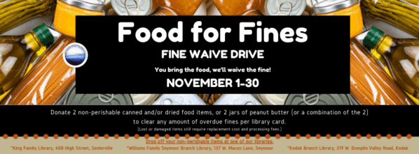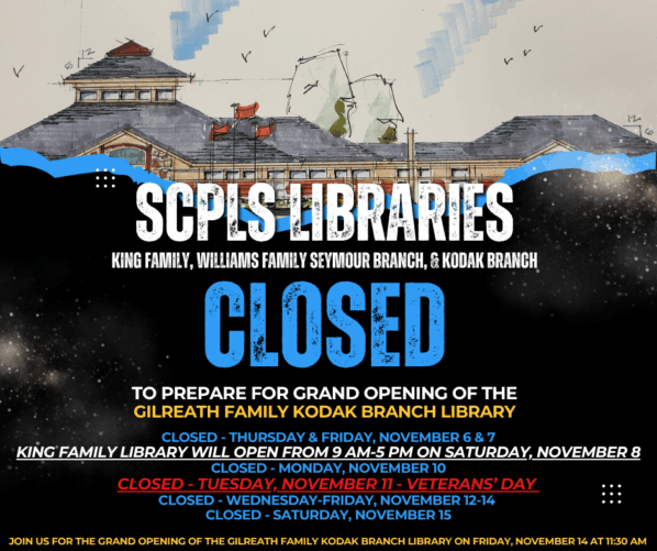 Extended closure announcement for Sevier County Libraries – King Family, Williams Family Seymour Branch, & Kodak Branch. See m0re details at https://tinyurl.com/28w3r3th.