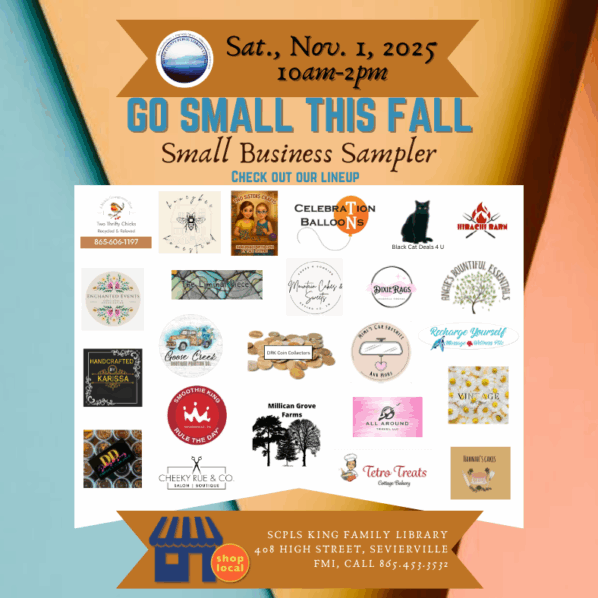 Join us on November 1 from 10 am-2 pm to shop all these awesome local small businesses during the Small Business Sampler at the King Family Library in Sevierville.