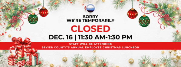 SCPLS libraries are temporarily closed from 11:30 am-1:30 pm so staff may attend the annual Sevier County Christmas luncheon.