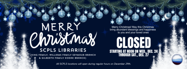 SCPLS libraries closed for Christmas holidays from noon on December 24 thru December 27.